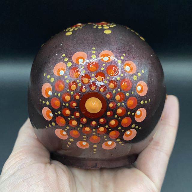 Nach dem vollständigen Trocknen wurde er mit schwarzer und burgund rot glitzernder Acrylfarbe grundiert und abschließend im Dot Painting Stile mit Acrylfarbe bemalt. Zum Abschluss erfolgte eine Lackierung mit Glanzlack auf Kunstharzbasis. Er ist somit für den Innen - und Außenbereich geeignet.