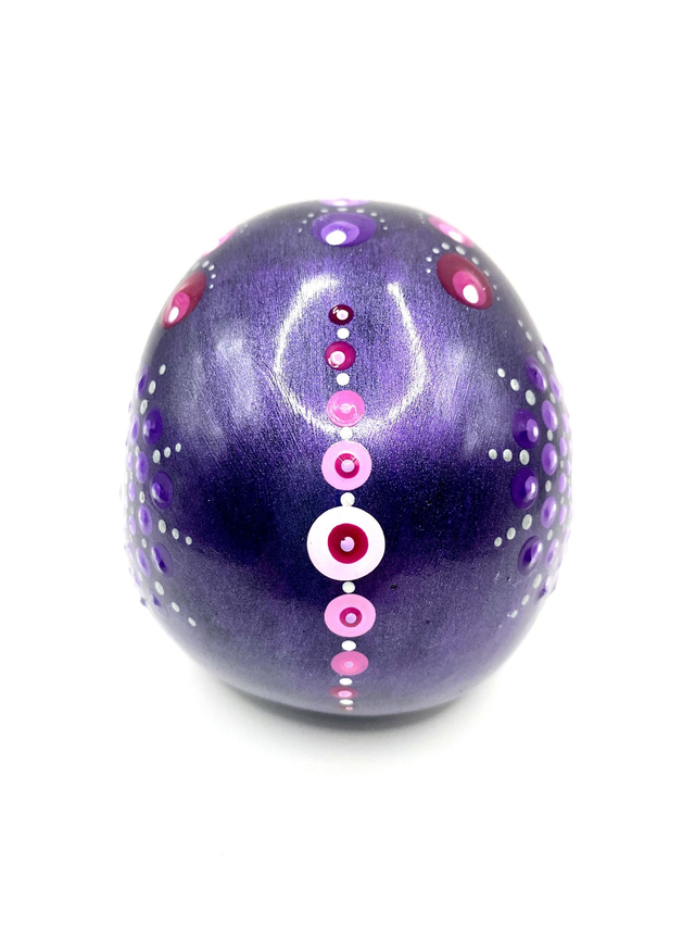 Nach dem vollständigen Trocknen wurde er mit schwarzer und lila metallic glitzernder Acrylfarbe grundiert und abschließend im Dot Painting Stile mit Acrylfarbe bemalt. Zum Abschluss erfolgte eine Lackierung mit Glanzlack auf Kunstharzbasis. Er ist somit für den Innenbereich geeignet. Bitte von Wasser fernhalten.