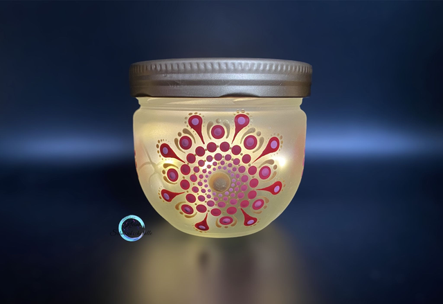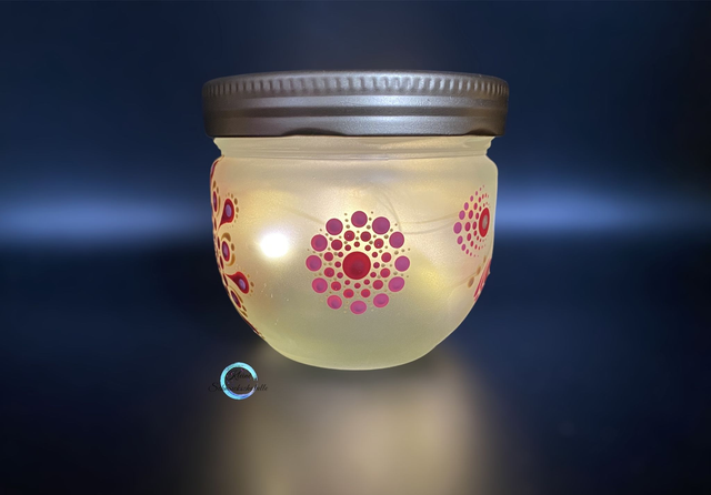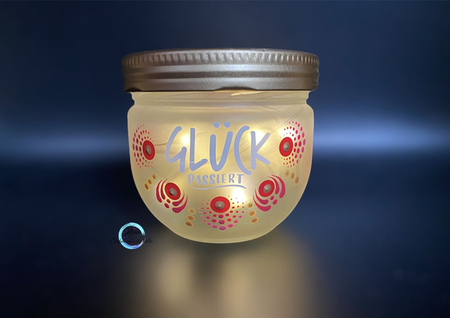 Handbemaltes Glas „Glück“ im Dot Painting Style, inkl. Beleuchtung. Es handelt sich um ein Einzelstück.