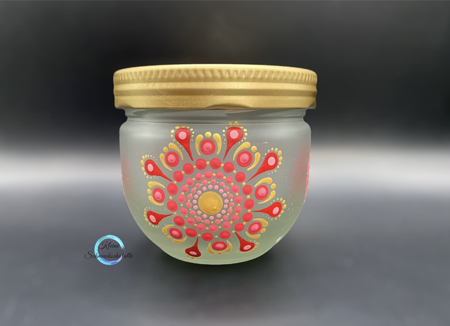 Das Glas wurde mit Milky Glass Spray grundiert und anschließend mit Acryfarbe in verschiedenen Rottönen und Gold bemalt. Es wurde nach Fertigstellung nochmals mit Milky Glass Spray besprüht. Es ist für den Innenbereich geeignet.