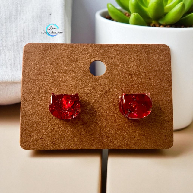 In Handarbeit hergestellter, zarter Ohrstecker aus transparentem UV-Resin und rotem Glitter. Der Hintergrund der Ohrringe ist in Silber bzw. transparent gehalten, je nach Auswahl der Variante. Der Stecker ist aus Edelstahl, nickelfrei
