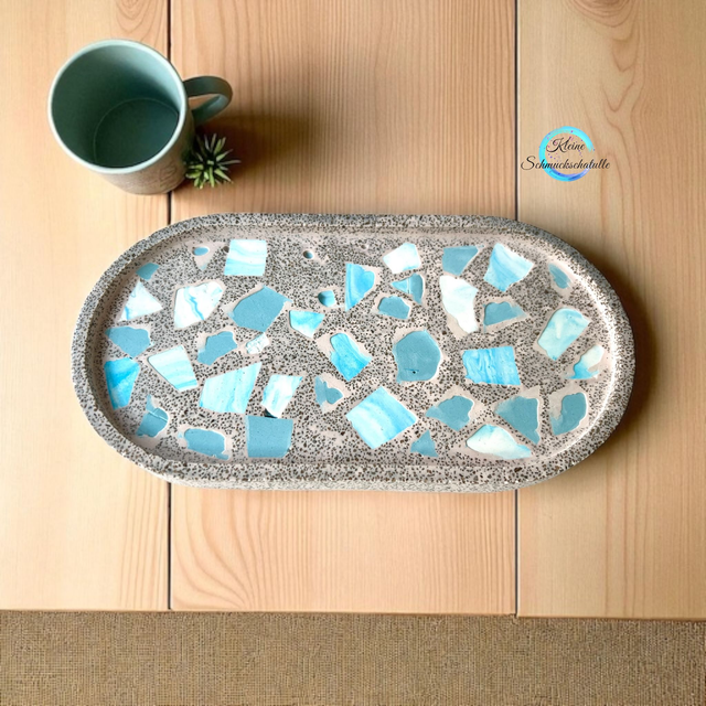 Tablett sandfarben mit eingearbeitetem blauen Gießstücken und feinem goldenen Dekosand, gegossen aus Keracraft Gießpulver