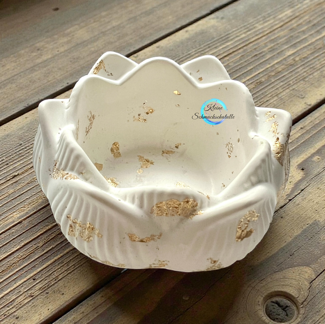 Eingearbeitet ist ein feines Blattgoldimitat. Der Halter kam auch als kleine Aufbewahrungsschale verwendet werden.